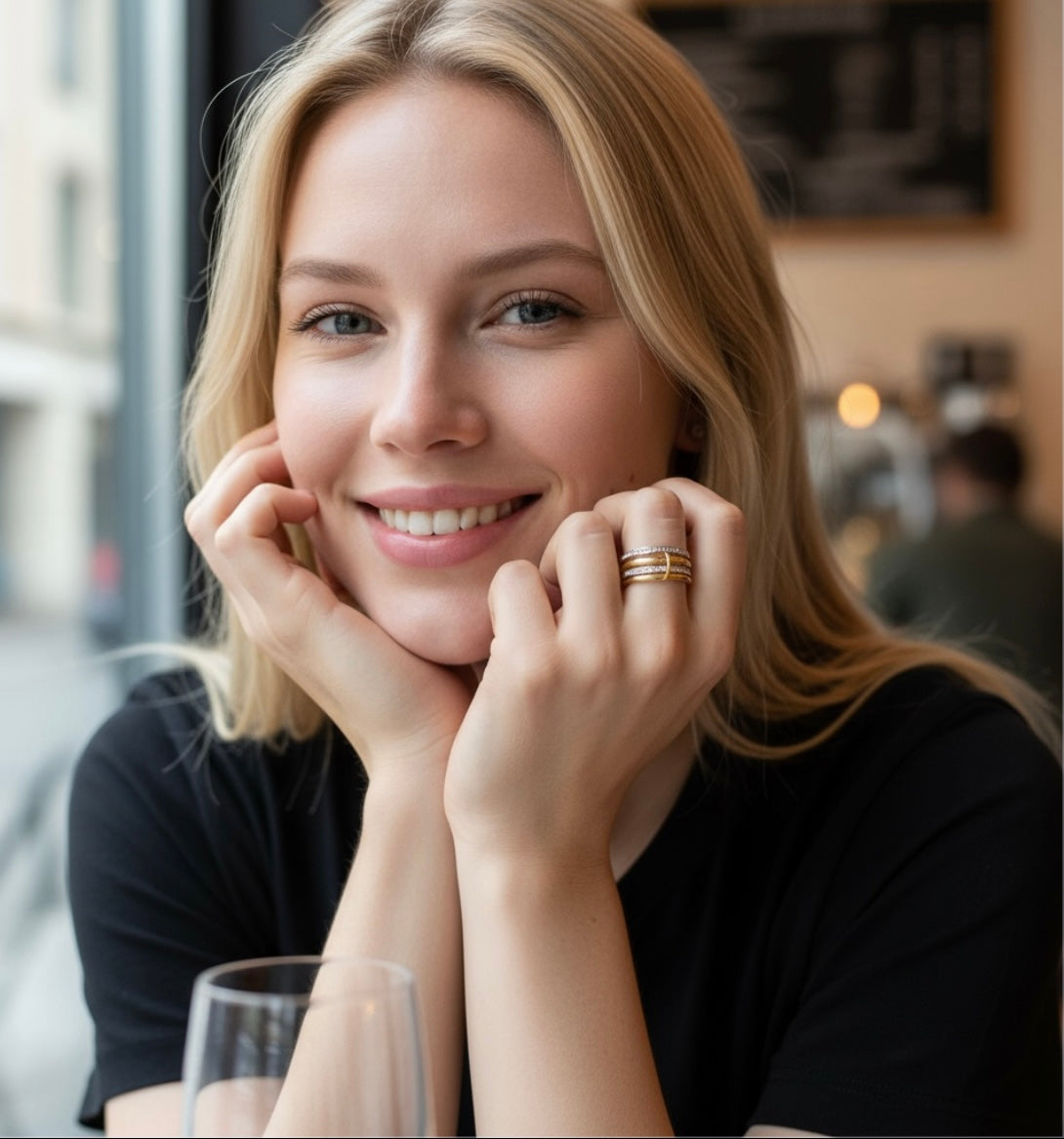 vereint zeitlose Eleganz mit modernem Design. Gefertigt aus hochwertigem Edelstahl und veredelt mit 18K Gold, besticht er durch sein mehrlagiges, verknüpftes Muster. Funkelnde Zirkonia-Steine setzen dezente Highlights und machen den Ring zu einem stilvollen Accessoire – perfekt für Frauen, Männer oder Paare, ob im Alltag oder als Geschenk für einen besonderen Menschen.