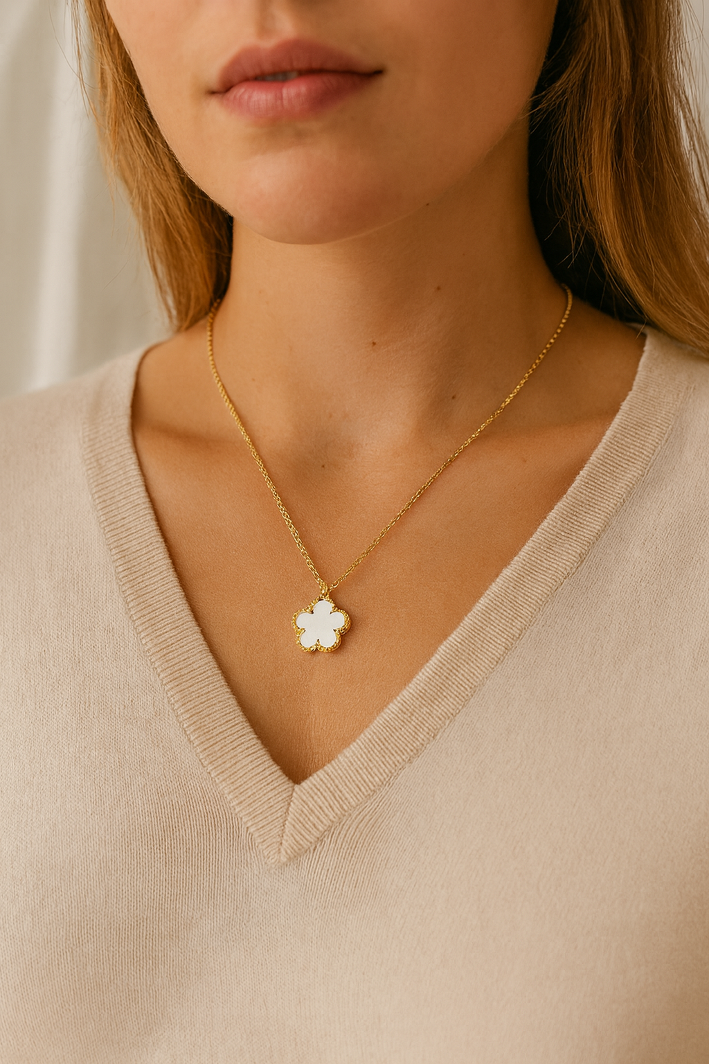 Der feine Anhänger in Blütenform mit weißem Schimmer verleiht jedem Outfit eine edle, feminine Note – perfekt für Frauen, die dezente Schönheit lieben.